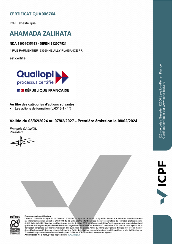L'ensemble de nos formations sont certifiées Qualiopi et ICPF